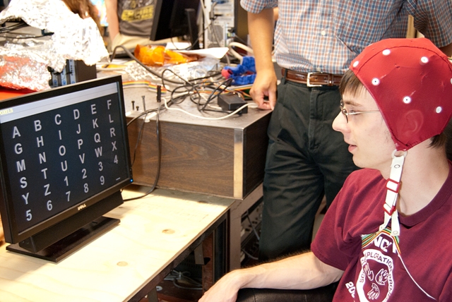 David Salter ’12 demonstrates how the brain-computer interface works.