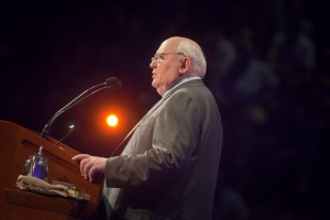 “We are reaping the consequences of a strategy that is not conducive to cooperation and partnership, to living in a new global situation,” said Mikhail Gorbachev, former President of the Soviet Union, to a crowd of 3,600 on Oct. 19 in the Allan P. Kirby Field House and many others via a live streaming broadcast in 13 locations from coast to coast, including northern Mexico. “People are asking ‘why do our leaders want to decide everything at the expense of the people?’”