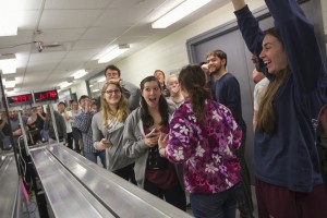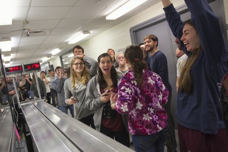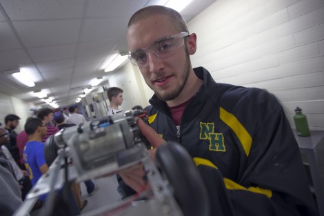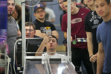 Student teams from the Manufacturing and Design course competed in a year-end drag race. The project challenges mechanical engineering students to design a dragster using engineering analysis so that it can race down a track and come to a stop after crossing the finish line. The winner is determined by a combination of speed, braking, and manufacturing cost. The course was taught by Jeff Helm, associate professor of mechanical engineering.