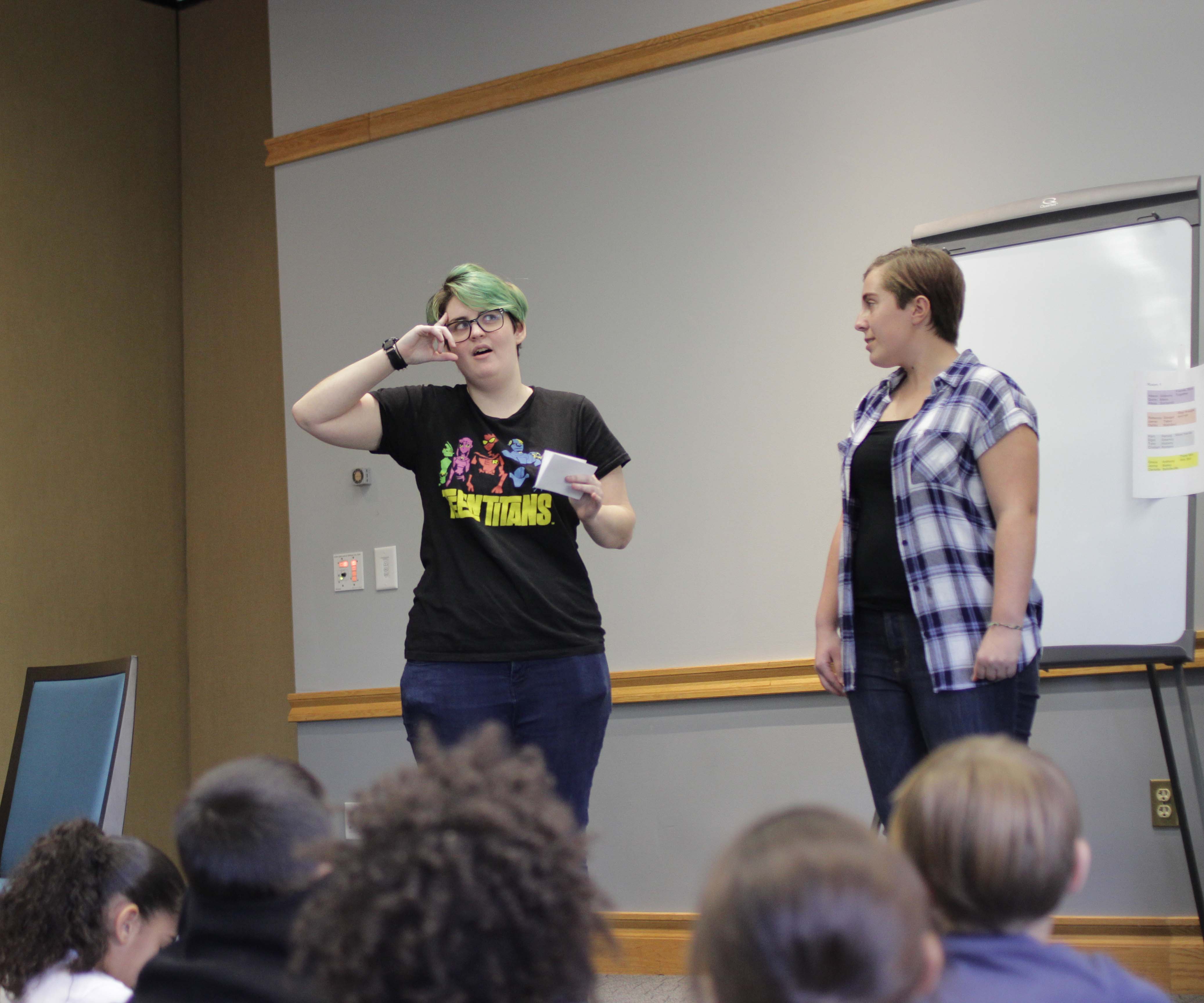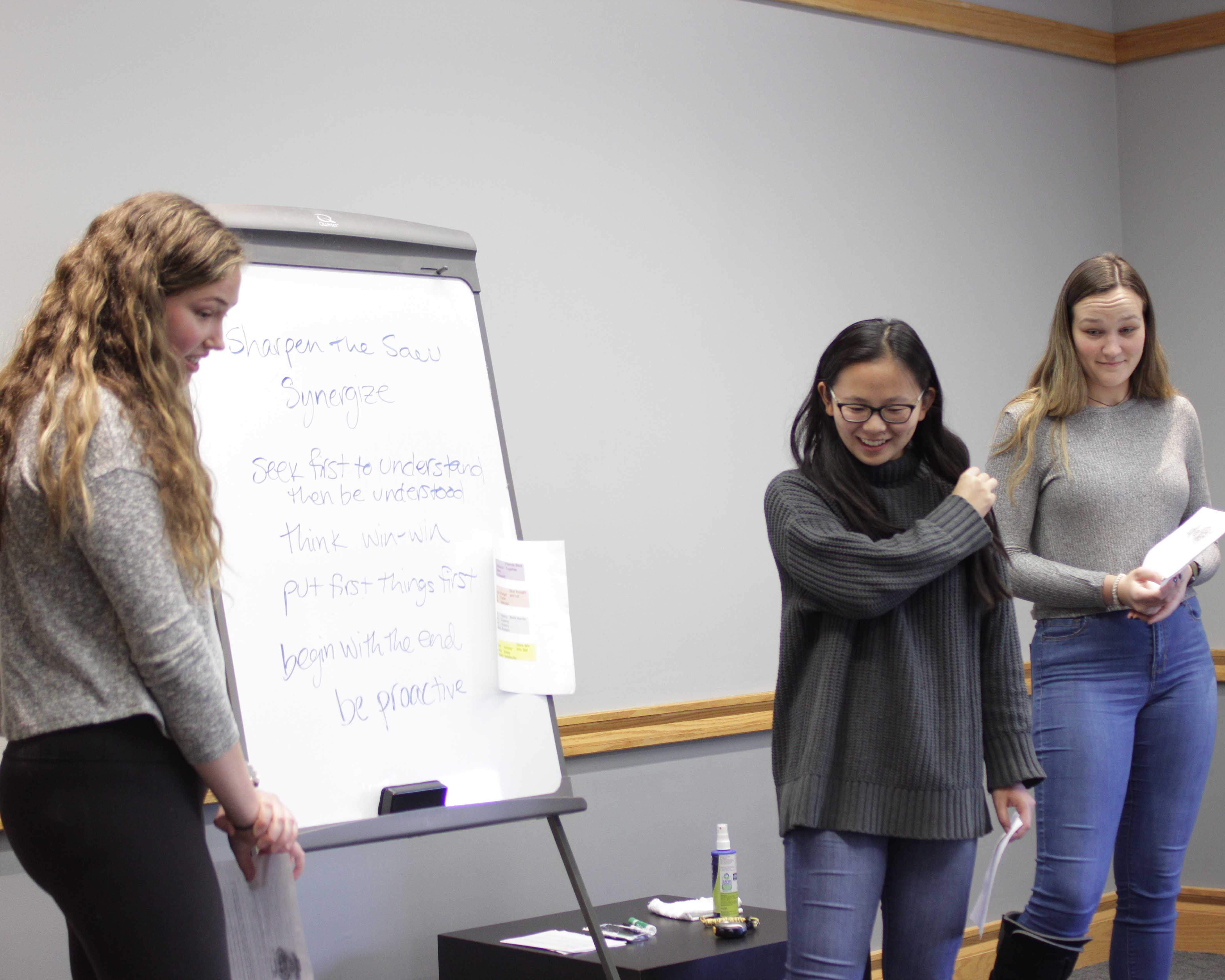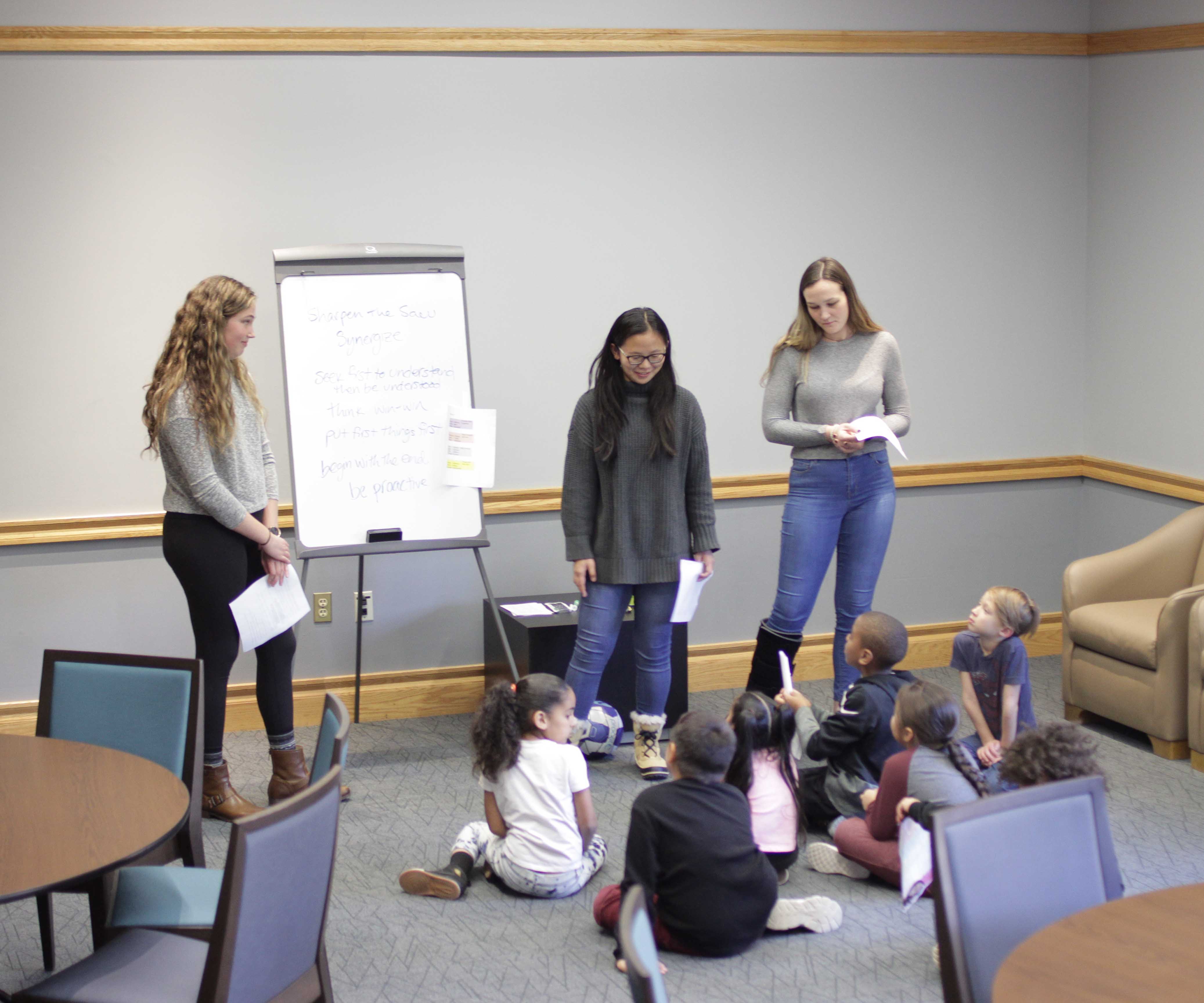 If one girl wants to play soccer but her friend wants to play tag, what can we do? With win-win thinking, everyone can get what they need. Students tried to think of solutions to skits that would make all parties happy.