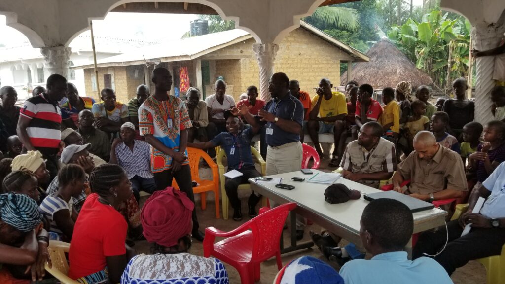 Rex Ahene (center) addresses a community meeting in Port Loko in the North West Province of Sierra Leone.