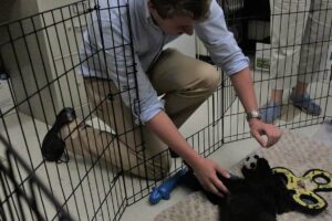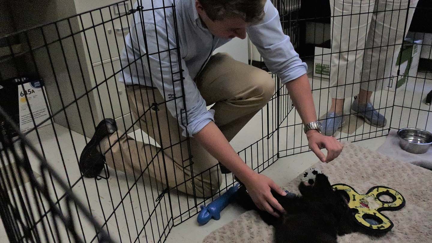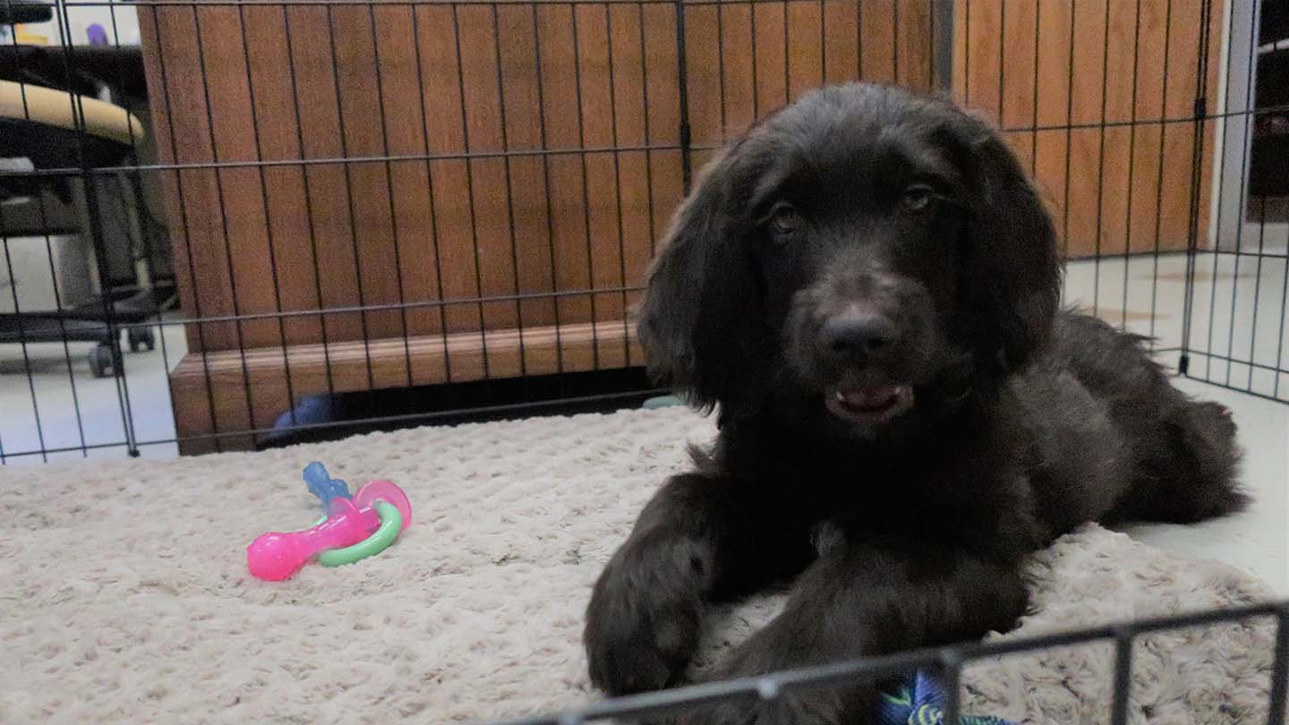 On a visit to meet Jack, Trent’s office is bustling with students and faculty members stopping in to give belly rubs to the good boy. Jack has a spacious pen aside Trent’s desk, outfitted with a cozy bed and a variety of toys to help satisfy his puppy teeth.