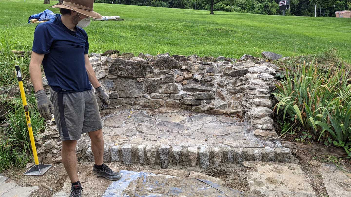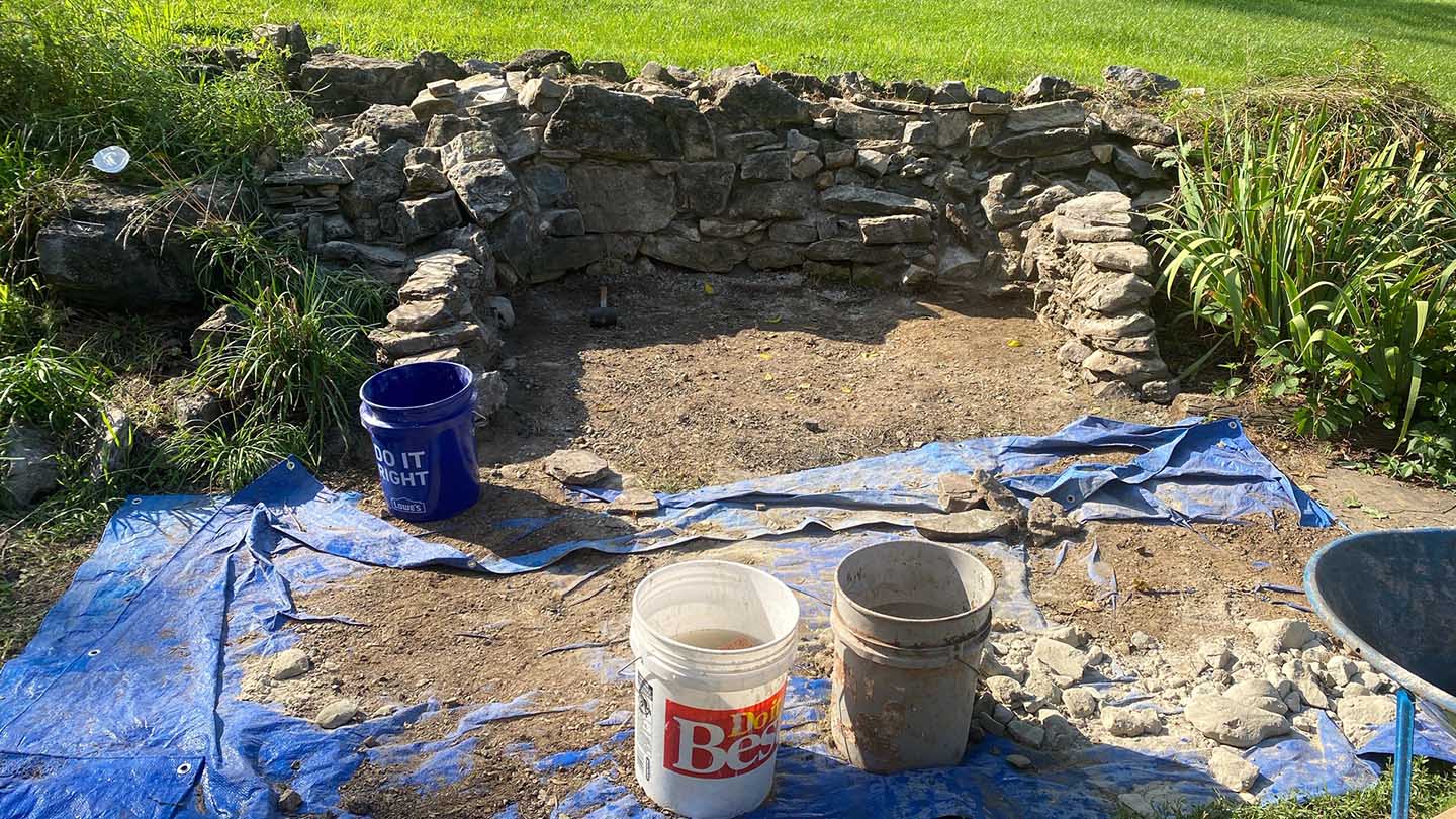 One hand is Edwin Landis ’56, an active member of PAHS, who has memories of visiting the house as a child; the owner back then delivered coal to the Landis household. Landis, seeing the need to repair the fire pit, reached out to Art Kney, professor of civil engineering and director of Landis Center for Community Engagement.