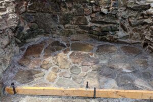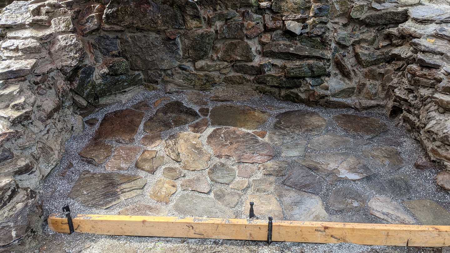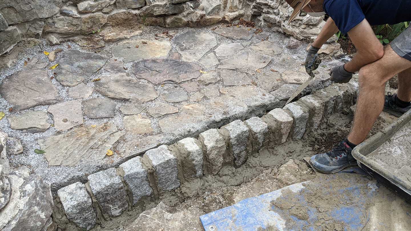 Fiske, several SEES members, and other student volunteers spent two weekends restoring the fire pit: removing weeds, rebuilding side walls, packing mortar, digging a base, pouring base layers, leveling and screening materials, tamping down, puzzling fieldstones into a pattern, filling gaps, and adding finishing touches.