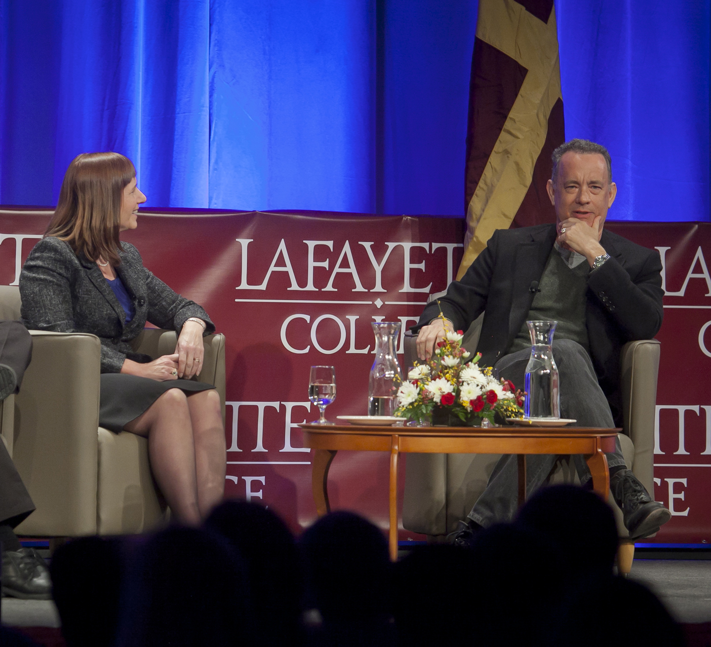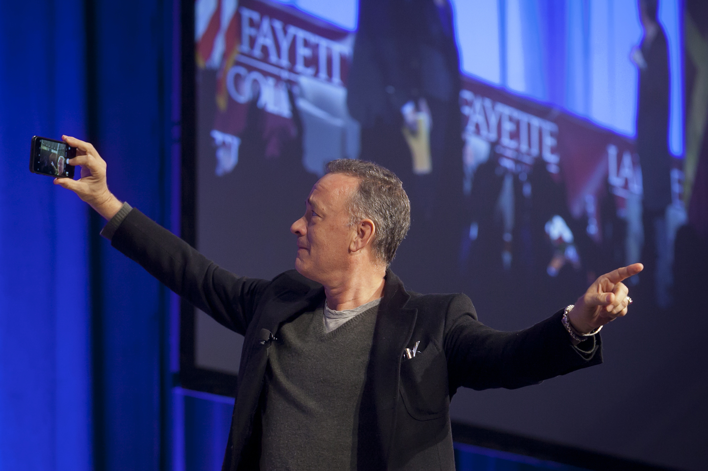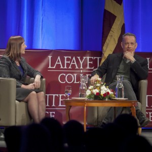 He strode across the stage in Kamine Gym, snapped a selfie with a crowd of Lafayette students mugging behind him, and for about 90 minutes Monday Oscar-winner Tom Hanks spoke of war, acting, and finding truth in Hollywood’s smoke and mirrors.